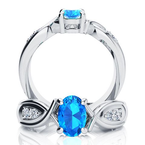 1 Carat Oval Shape Blue Topaz and Four Diamond Ring In 10 Karat White Gold