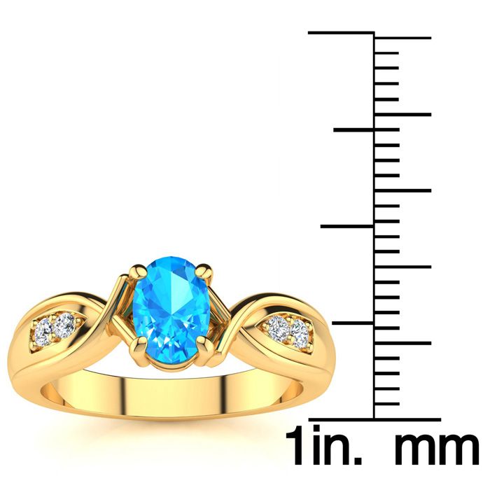 This stunning gemstone and diamond ring features one 7x5mm oval shape blue topaz gemstone at 1.00 carats. It is surrounded by 2 sparkling diamonds in I-J color, I1-I2 clarity at 0.04 carats. Total gem weight is 1 carat. This ring is crafted in 10 karat yellow gold.