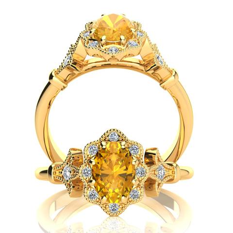 This stunning gemstone and halo diamond vintage ring features one 7x5mm oval shape citrine gemstone at 0.80 carats. It is surrounded by 10 sparkling diamonds in a halo and down the band in H-I color, I1-I2 clarity at 0.13 carats. Total gem weight is 0.93 carats. This ring is crafted in 14 karat yellow gold.