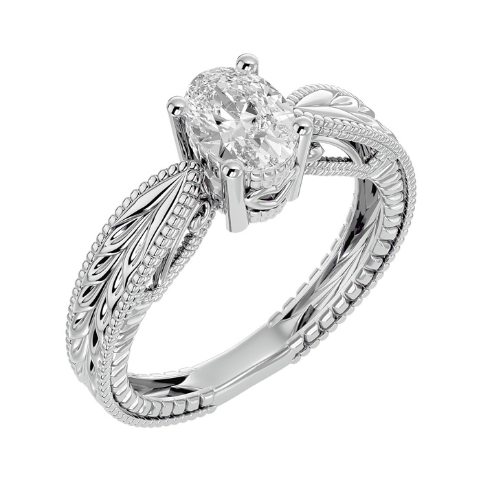 1 Carat Natural Oval Shape Diamond Solitaire Engagement Ring with Tapered Etched Band In 14 Karat White Gold