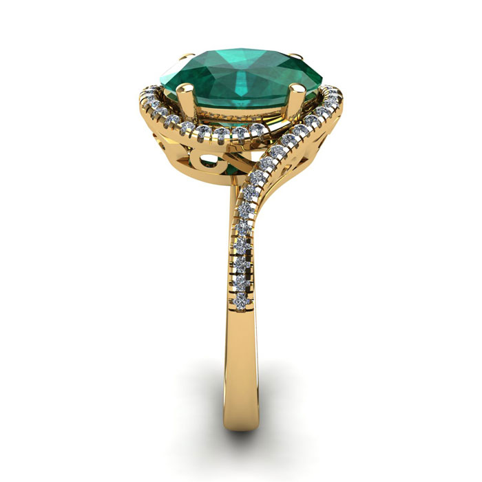 This stunning gemstone and halo diamond ring features one 7x5mm oval shape emerald gemstone at 0.80 carats. It is surrounded by 46 sparkling diamonds in a halo and down the band in H-I color, I1-I2 clarity at 0.23 carats. Total gem weight is 1.03 carats. This ring is crafted in 14 karat yellow gold.