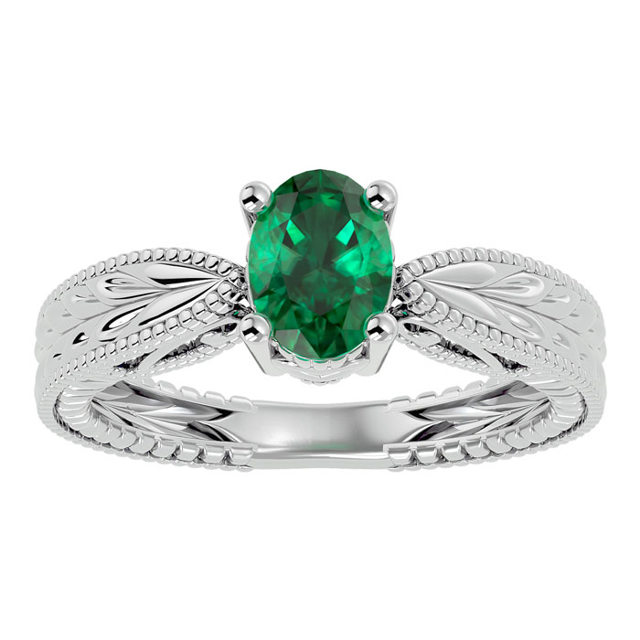 1 Carat Oval Shape Emerald Ring With Tapered Etched Band In 14 Karat White Gold