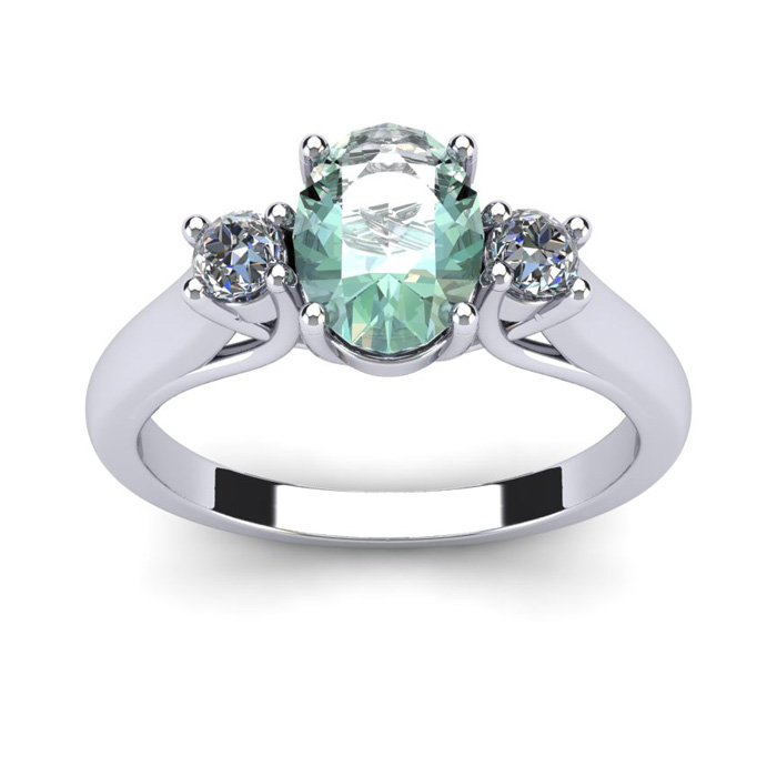 1 Carat Oval Shape Green Amethyst and Two Diamond Ring In 14 Karat White Gold