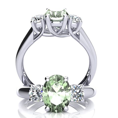 1 Carat Oval Shape Green Amethyst and Two Diamond Ring In 14 Karat White Gold