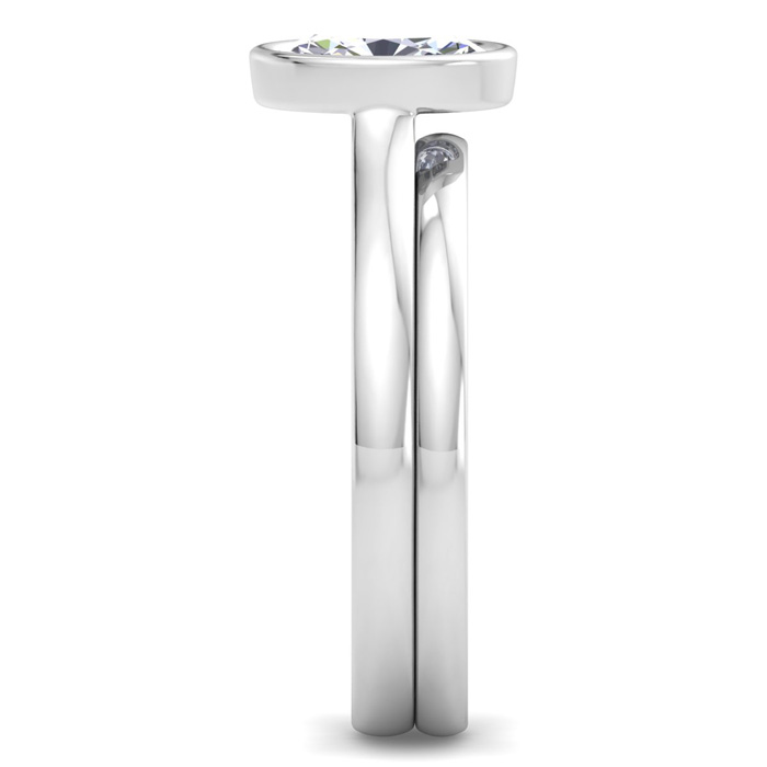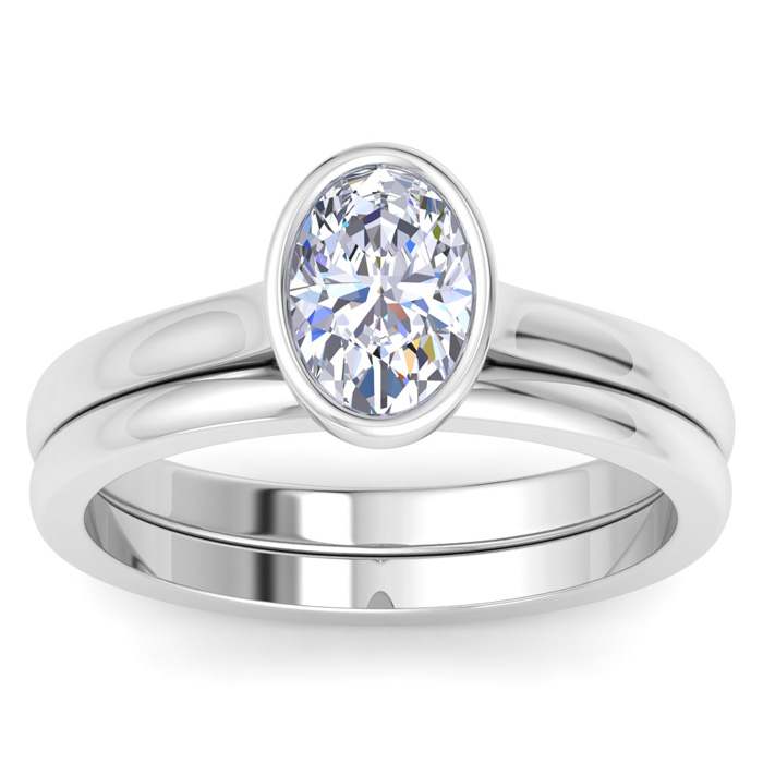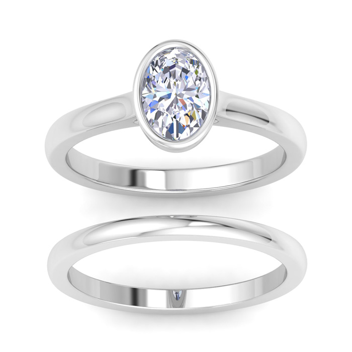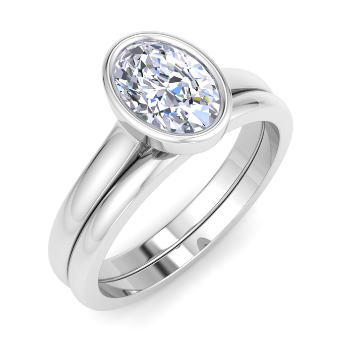 1 Carat Oval Shape Lab Grown Diamond Ring With Matching Band In 14K White Gold, Solitaire Bezel Setting