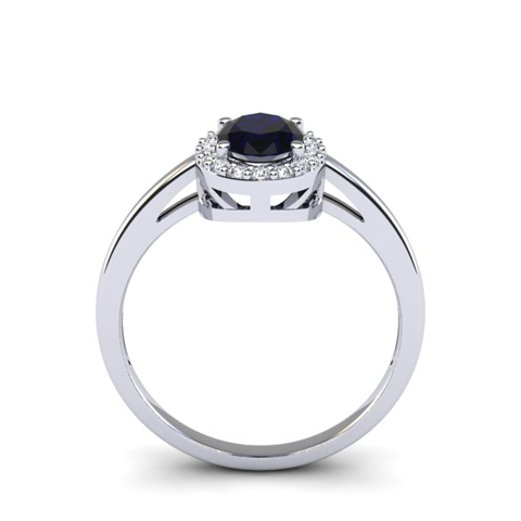 This stunning gemstone and halo diamond ring features one 7x5mm oval shape sapphire gemstone at 1 carats. It is surrounded by 18 sparkling diamonds in a halo in I-J color, I1-I2 clarity at 0.09 carats. Total gem weight is 1.09 carats. This ring is crafted in 14 karat white gold.