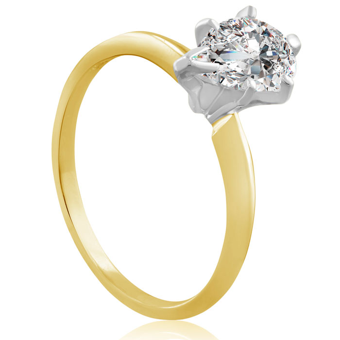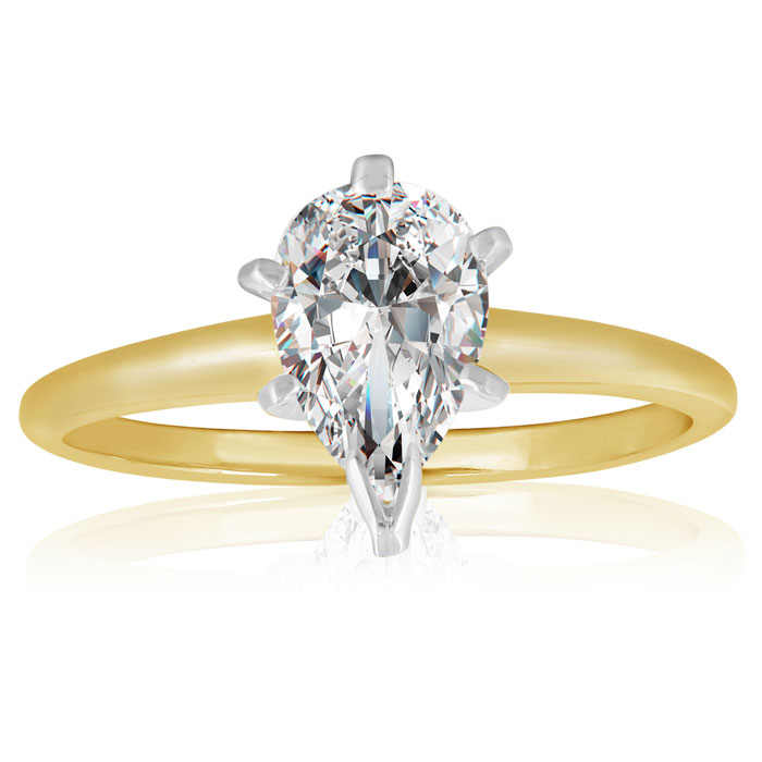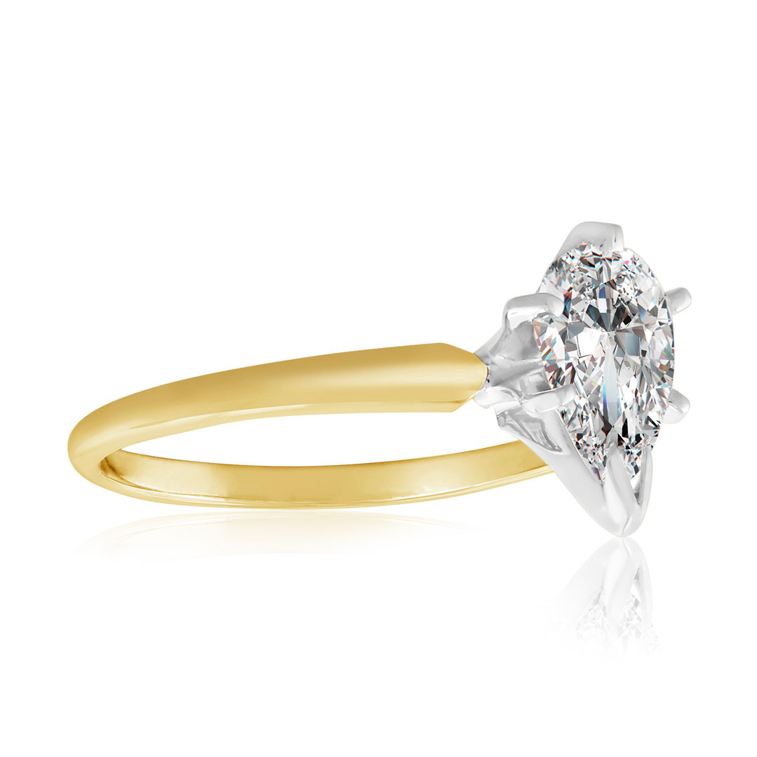 This classic solitaire ring features a 1 carat pear shape diamond in H-I color, SI2-I1 clarity. This ring is in 14 karat yellow gold.