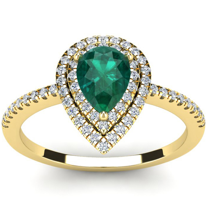 This stunning gemstone and double halo diamond ring features one 7x5mm pear shape emerald gemstone at 0.65 carats. It is surrounded by 62 sparkling diamonds in a double halo and down the band in I-J color, I1-I2 clarity at 0.31 carats. Total gem weight is 0.96 carats. This ring is crafted in 14 karat yellow gold.