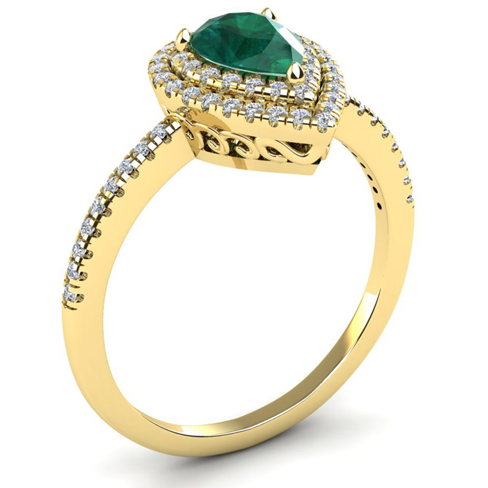 1 Carat Pear Shape Emerald and Double Halo Diamond Ring In 14 Karat Yellow Gold