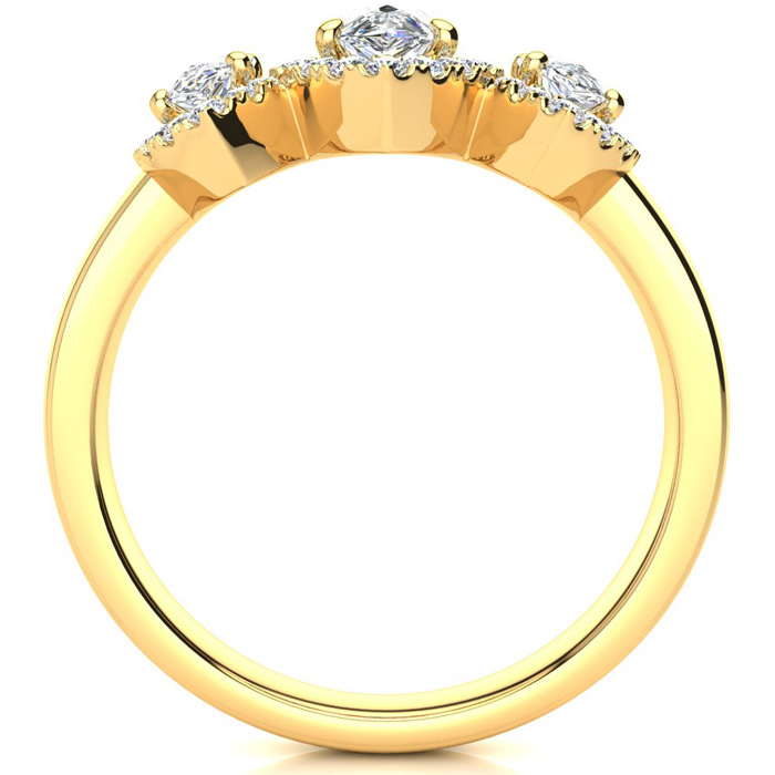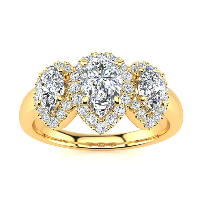 1 Carat Pear Shape Halo Diamond Three Stone Ring In 14K Yellow Gold
