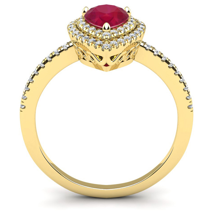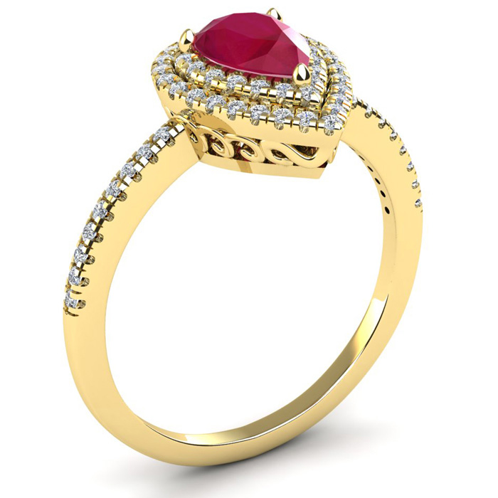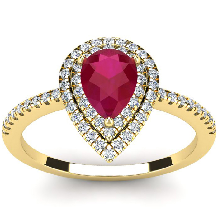 1 Carat Pear Shape Ruby and Double Halo Diamond Ring In 14 Karat Yellow Gold