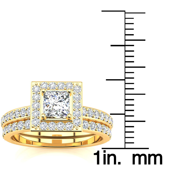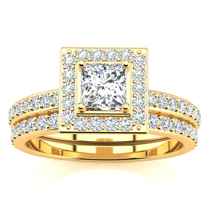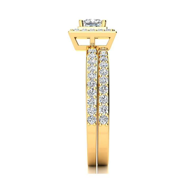 1 Carat Princess Cut Pave Halo Lab Grown Diamond Bridal Set in 14k Yellow Gold