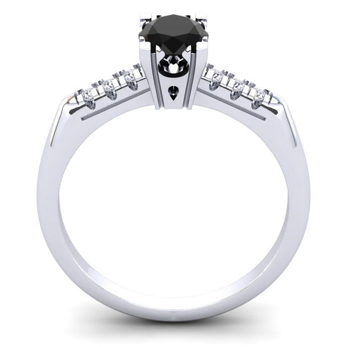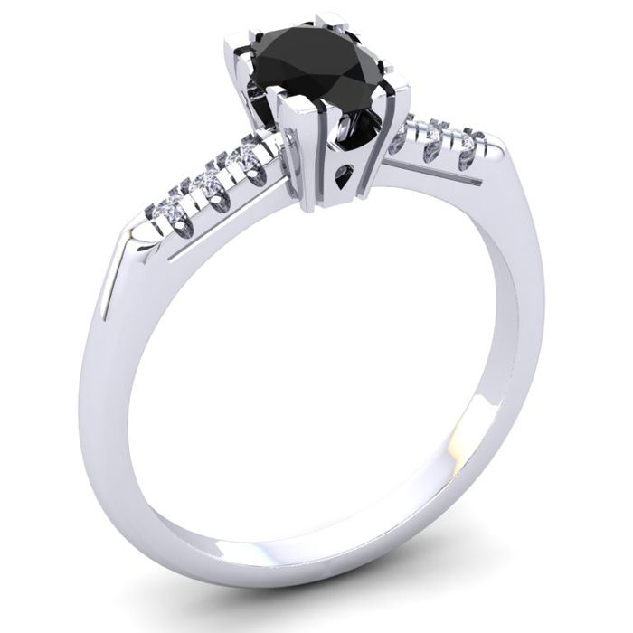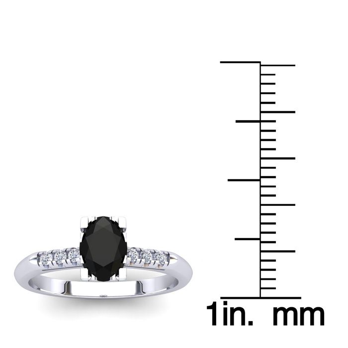 This rose cut black diamond ring features one 7x5mm oval shape shape black diamond. It is approximately 1.00 carats. It is surrounded by 6 sparkling white diamonds in I-J color, I1-I2 clarity at 0.09 carats. Total carat weight is approximately 1.09 carats. This ring is in 14 karat white gold.