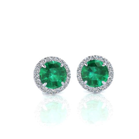 These stunning gemstone and halo diamond earrings feature two 5mm round shape emerald gemstones at 1.00 carats. The gemstones are surrounded by 40 sparkling diamonds in a halo in H-I color, I1-I2 clarity at 0.12 carats. Total gem weight is 1.12 carats. These earrings are crafted in 14 karat white gold. These earrings come with comfortable and secure post with friction backs.