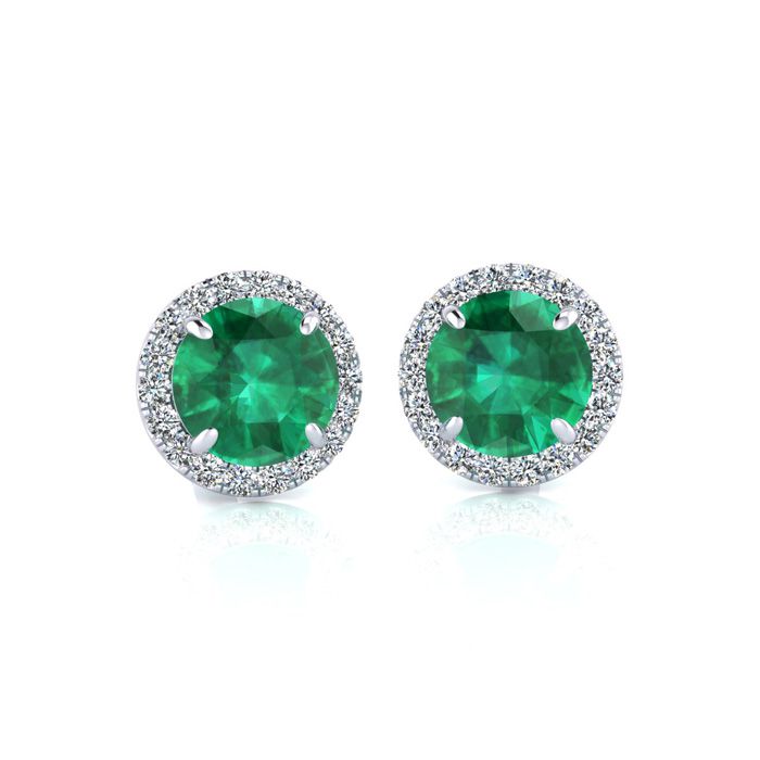These stunning gemstone and halo diamond earrings feature two 5mm round shape emerald gemstones at 1.00 carats. The gemstones are surrounded by 40 sparkling diamonds in a halo in H-I color, I1-I2 clarity at 0.12 carats. Total gem weight is 1.12 carats. These earrings are crafted in 14 karat white gold. These earrings come with comfortable and secure post with friction backs.