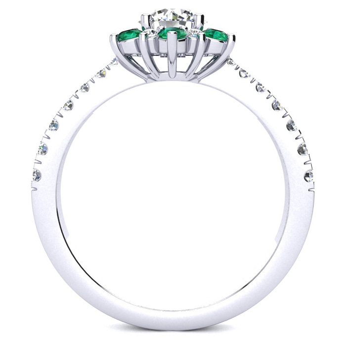 This ring features a 1/2 carat round shape center diamond in H-I color. There are 20 sparkling side diamonds in a halo and down the band in SI2-I1 clarity and 6 emerald gemstones at approximately 1/2 carat. Total gem weight is approximately 1 carat. This ring is in 14 karat white gold. Ring top measures 7x7mm.