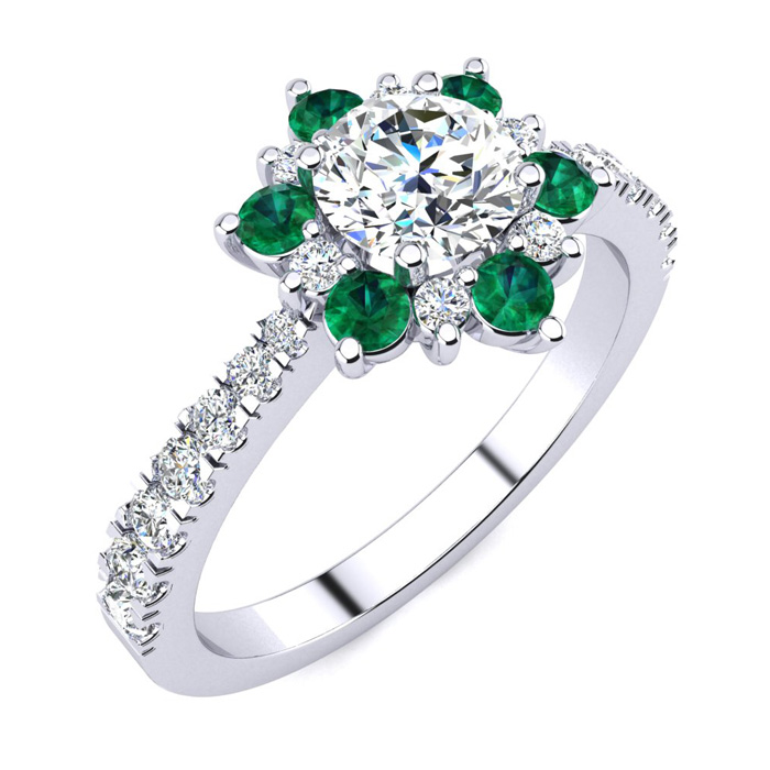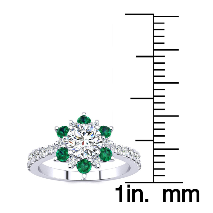 1 Carat Natural Round Shape Flower Halo Emerald and Diamond Engagement Ring In 14K White Gold