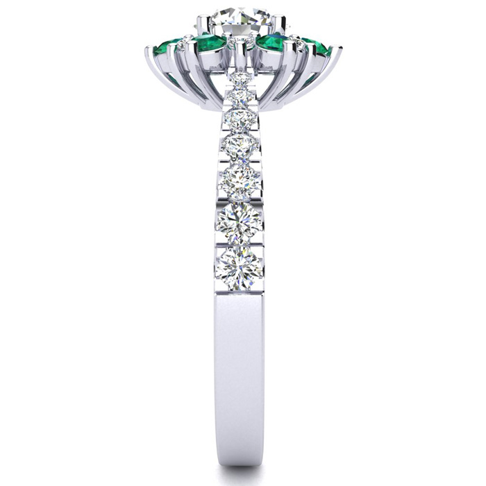 This ring features a clarity enhanced 1/2 carat round shape center diamond in I-J color. There are 20 sparkling side diamonds in a halo and down the band in I1-I2 clarity and 6 emerald gemstones at approximately 1/2 carat. Total gem weight is approximately 1 carat. This ring is in 14 karat white gold. Ring top measures 7x7mm.