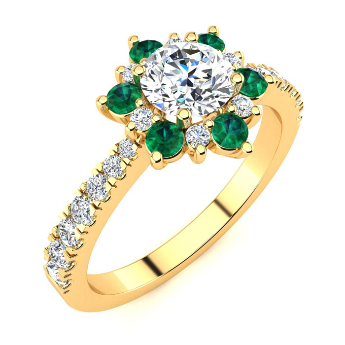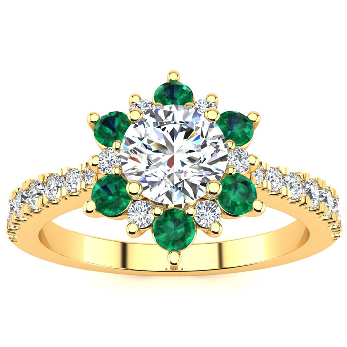 1 Carat Natural Round Shape Flower Halo Emerald and Diamond Engagement Ring In 14K Yellow Gold
