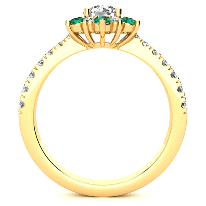 This ring features a 1/2 carat round shape center diamond in H-I color. There are 20 sparkling side diamonds in a halo and down the band in SI2-I1 clarity and 6 emerald gemstones at approximately 1/2 carat. Total gem weight is approximately 1 carat. This ring is in 14 karat yellow gold. Ring top measures 7x7mm.