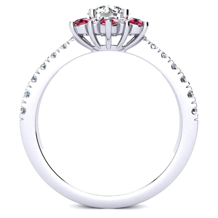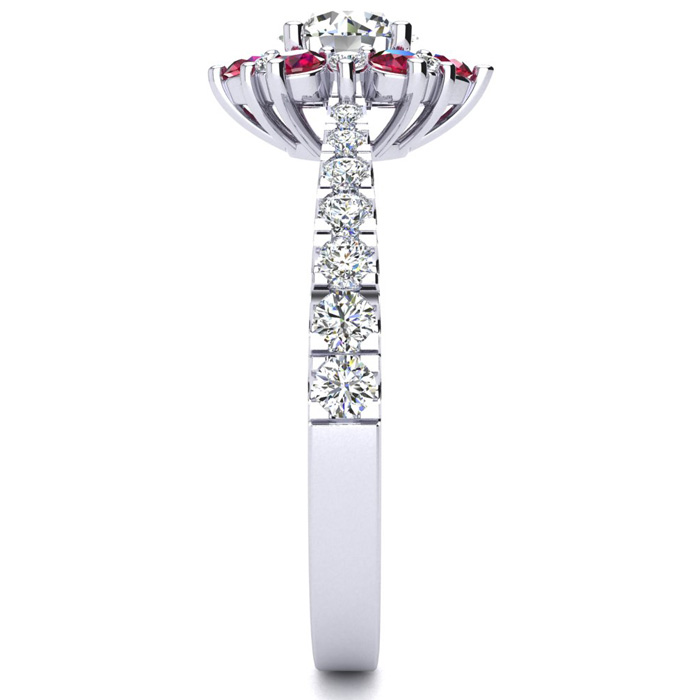 This ring features a 1/2 carat round shape center diamond in H-I color. There are 20 sparkling side diamonds in a halo and down the band in SI2-I1 clarity and 6 ruby gemstones at approximately 1/2 carat. Total gem weight is approximately 1 carat. This ring is in 14 karat white gold. Ring top measures 7x7mm.