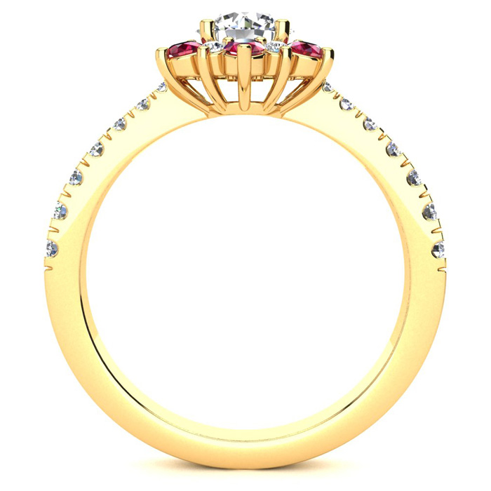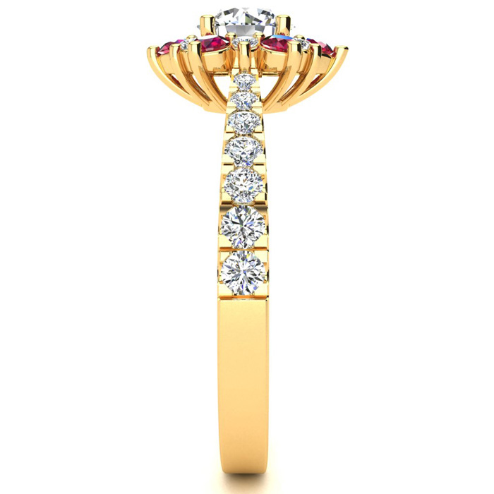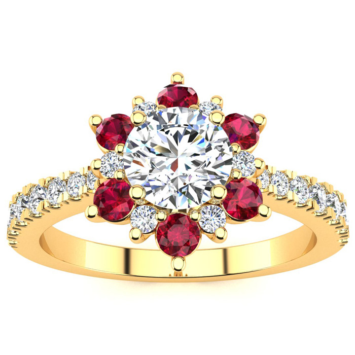 This ring features a clarity enhanced 1/2 carat round shape center diamond in I-J color. There are 20 sparkling side diamonds in a halo and down the band in I1-I2 clarity and 6 ruby gemstones at approximately 1/2 carat. Total gem weight is approximately 1 carat. This ring is in 14 karat yellow gold. Ring top measures 7x7mm.