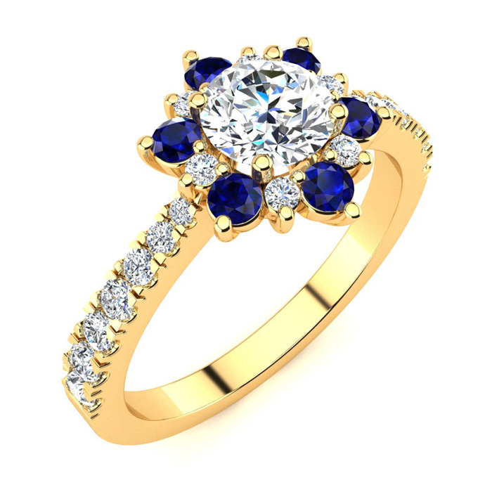 1 Carat Natural Round Shape Flower Halo Sapphire and Diamond Engagement Ring In 14K Yellow Gold