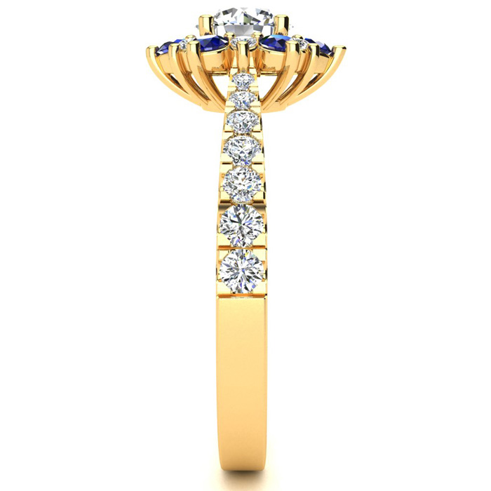 This ring features a 1/2 carat round shape center diamond in H-I color. There are 20 sparkling side diamonds in a halo and down the band in SI2-I1 clarity and 6 sapphire gemstones at approximately 1/2 carat. Total gem weight is approximately 1 carat. This ring is in 14 karat yellow gold. Ring top measures 7x7mm.