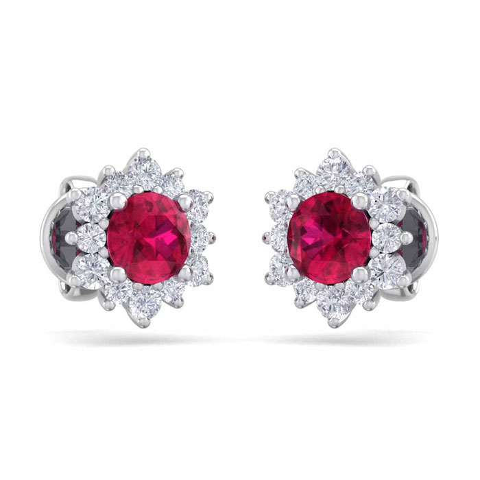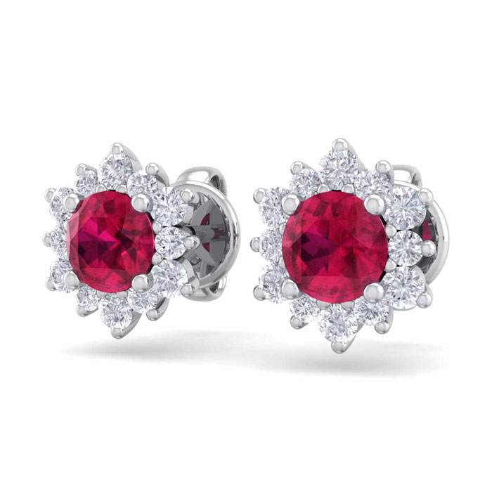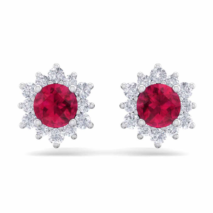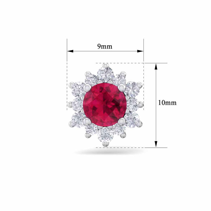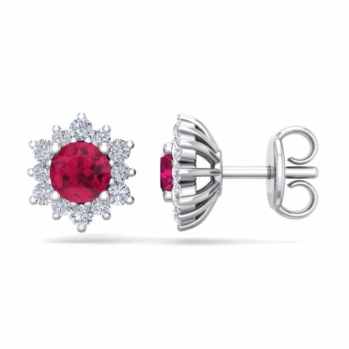 1 Carat Round Shape Flower Ruby and Diamond Halo Stud Earrings In 14 Karat White Gold