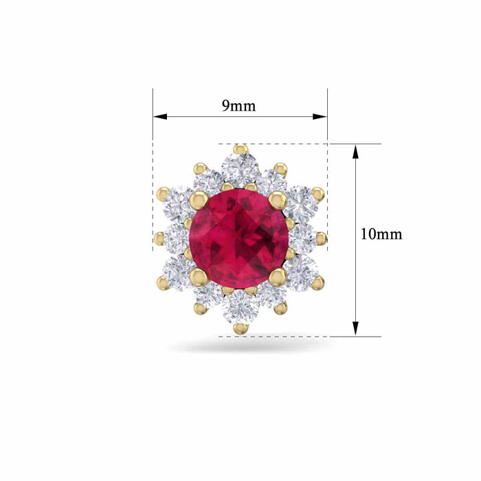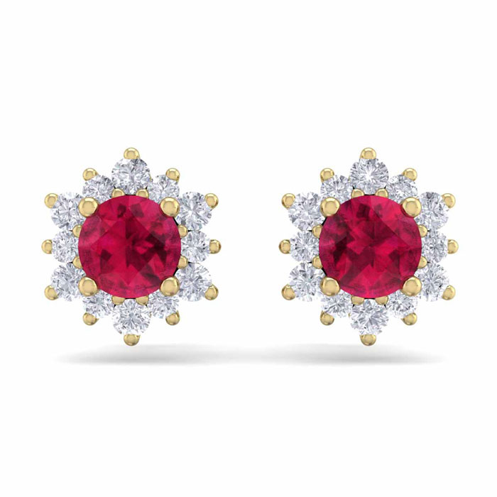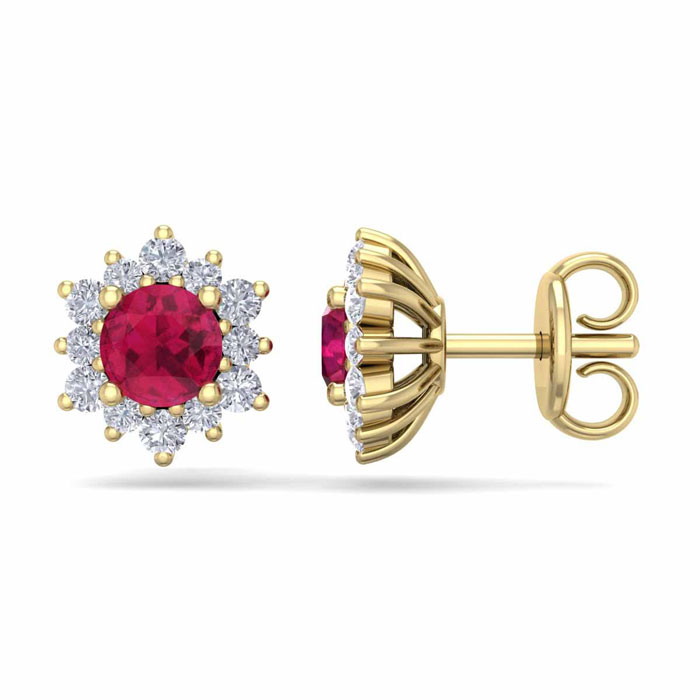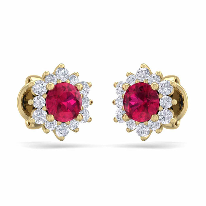 1 Carat Round Shape Flower Ruby and Diamond Halo Stud Earrings In 14 Karat Yellow Gold