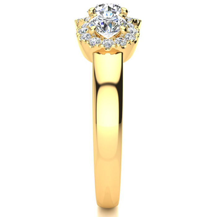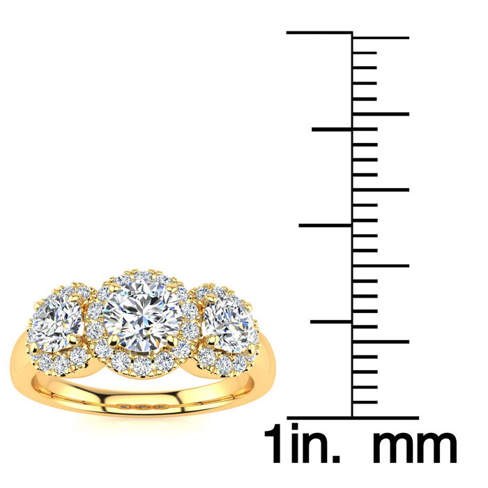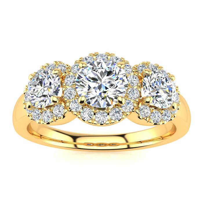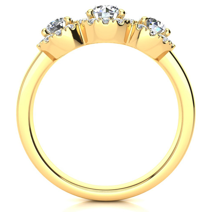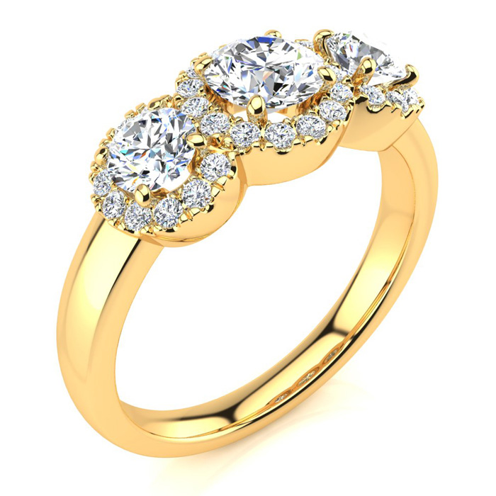 1 Carat Round Shape Halo Lab Grown Diamond Three Stone Ring In 14K Yellow Gold