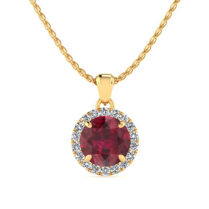 This stunning gemstone and halo diamond necklace features one 6mm round shape ruby gemstone at 1.05 carats. The gemstone is surrounded by 18 sparkling diamonds in a halo in H-I color, I1-I2 clarity at 0.09 carats. Total gem weight is 1.14 carats. This necklace is crafted in 14 karat yellow gold. This necklace comes with an 18 inch cable chain with spring ring clasp.