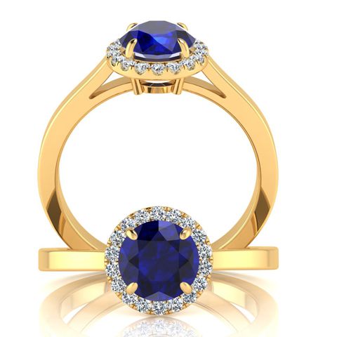 1 Carat Round Shape Sapphire and Halo Diamond Ring In 14 Karat Yellow Gold