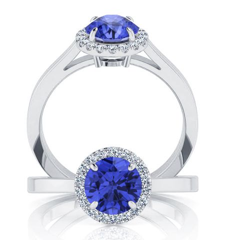 This stunning gemstone and halo diamond ring features one 6mm round shape tanzanite gemstone at 0.90 carats. It is surrounded by 18 sparkling diamonds in a halo in H-I color, I1-I2 clarity at 0.09 carats. Total gem weight is 0.99 carats. This ring is crafted in 14 karat white gold.