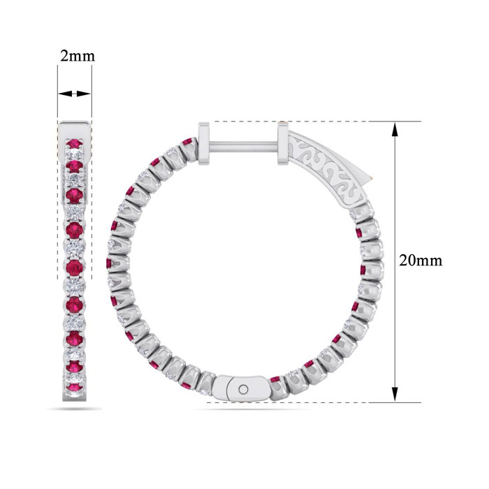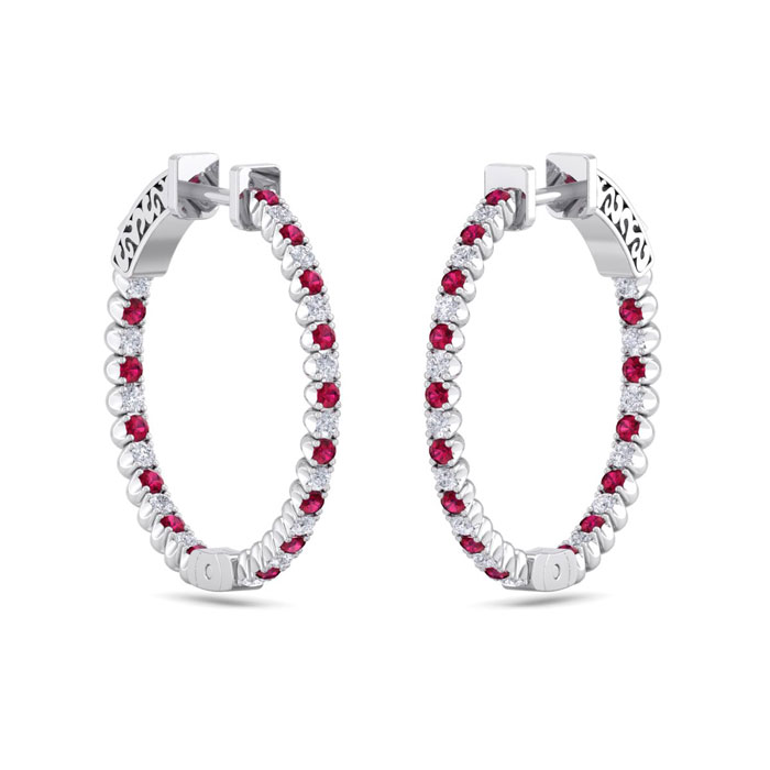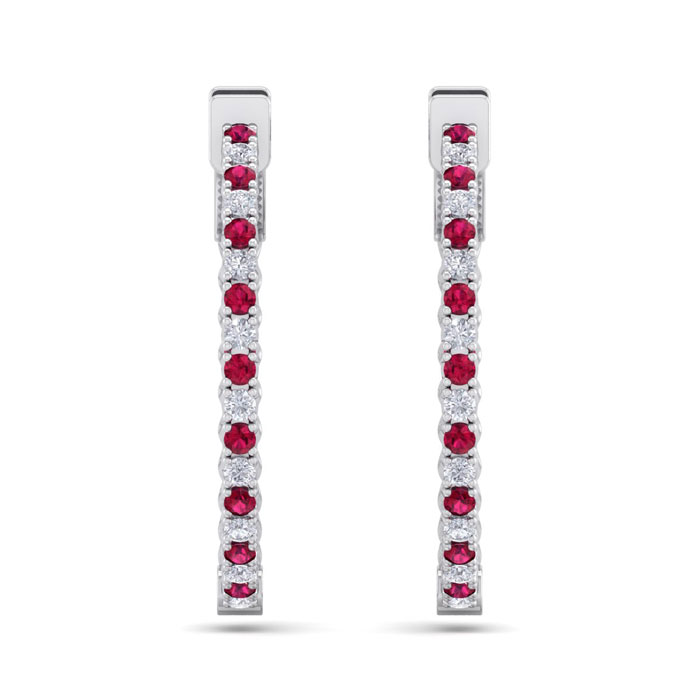 1 Carat Ruby and Diamond Hoop Earrings In 14 Karat White Gold, 3/4 Inch