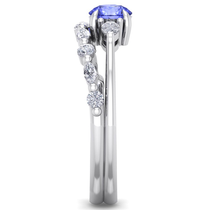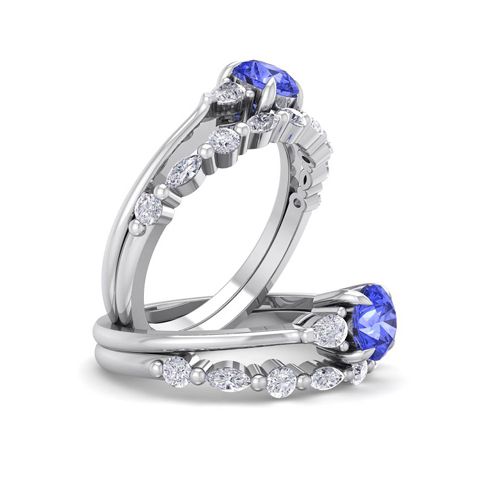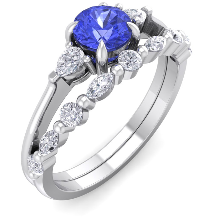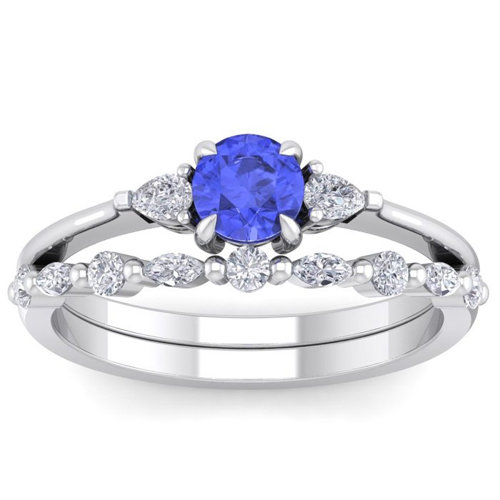 This elegant gemstone bridal set features one 5mm round shape tanzanite gemstone at approximately 0.55 carats. It is surrounded by 5 round, 4 marquise and 2 pear shape sparkling diamonds along the ring and matching band in I-J color, I1-I2 clarity at 1/3 carat total weight. Total gem weight is approximately 1 carat total weight. This ring is in 14 karat white gold.