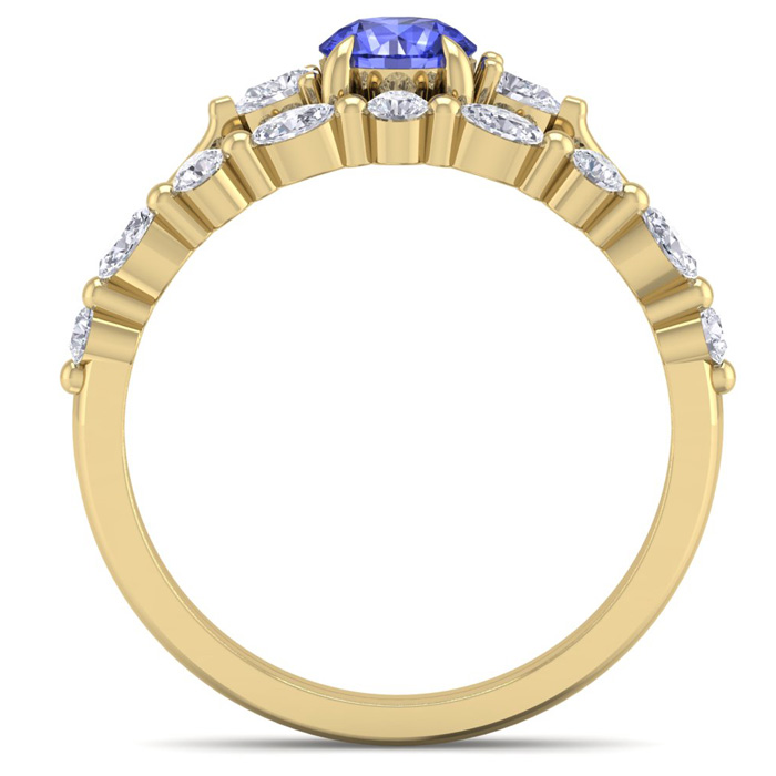 This elegant gemstone bridal set features one 5mm round shape tanzanite gemstone at approximately 0.55 carats. It is surrounded by 5 round, 4 marquise and 2 pear shape sparkling diamonds along the ring and matching band in I-J color, I1-I2 clarity at 1/3 carat total weight. Total gem weight is approximately 1 carat total weight. This ring is in 14 karat yellow gold.