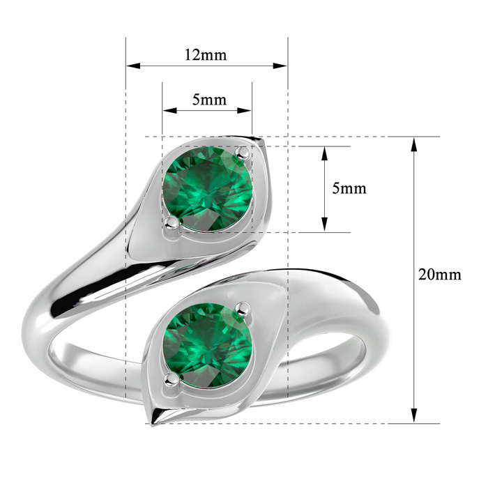 This elegant gemstone ring features two 5mm round shape emerald gemstones each weighing approximately 1/2 carat. Total carat weight is approximately 1 carat. This ring is in 14 karat white gold. *Retrograde Birthstones™ flips the idea of traditional birthstones. Wear your ½ birthday birthstone, your Retrograde Birthstone, “The Birthstone For Your Bad Side™.