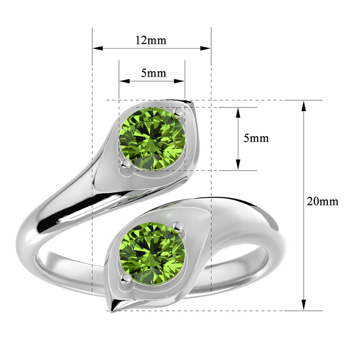 This elegant gemstone ring features two 5mm round shape peridot gemstones each weighing approximately 1/2 carat. Total carat weight is approximately 1 carat. This ring is in 14 karat white gold. *Retrograde Birthstones™ flips the idea of traditional birthstones. Wear your ½ birthday birthstone, your Retrograde Birthstone, “The Birthstone For Your Bad Side™.