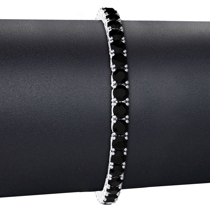 This classic mens diamond bracelet features shimmering black diamonds in I3 clarity. The 6 inch bracelet contains 39 black diamonds at 7.80 carats. The 6.5 inch bracelet contains 42 black diamonds at 8.60 carats. The 7 inch bracelet contains 45 black diamonds at 9.20 carats. The 7.5 inch bracelet contains 49 black diamonds at 9.80 carats. The 8 inch bracelet contains 53 black diamonds at 10.60 carats. The 8.5 inch bracelet contains 56 black diamonds at 11.20 carats. The 9 inch bracelet contains 59 black diamonds at 11.80 carats. This bracelet is approximately 3.8mm wide and is crafted in 14 karat white gold. This bracelet has a secure, box with tongue and safety clasp.