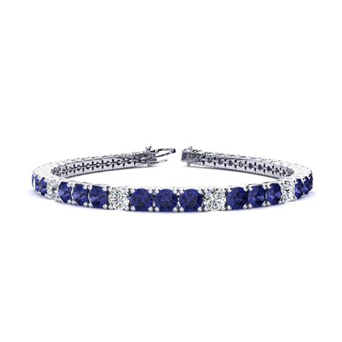 This classic gemstone bracelet features shimmering white diamonds in I-J color, I1-I2 clarity and tanzanite gemstones. The 6 inch bracelet contains 39 gemstones and diamonds at 7.50 carats. The 6.5 inch bracelet contains 42 gemstones and diamonds at 8.27 carats. The 7 inch bracelet contains 45 gemstones and diamonds at 8.85 carats. The 7.5 inch bracelet contains 49 gemstones and diamonds at 9.43 carats. The 8 inch bracelet contains 53 gemstones and diamonds at 10.20 carats. The 8.5 inch bracelet contains 56 gemstones and diamonds at 10.78 carats. The 9 inch bracelet contains 59 gemstones and diamonds at 11.35 carats. This bracelet is approximately 3.8mm wide and is crafted in 14 karat white gold. This bracelet has a secure, box with tongue and safety clasp.