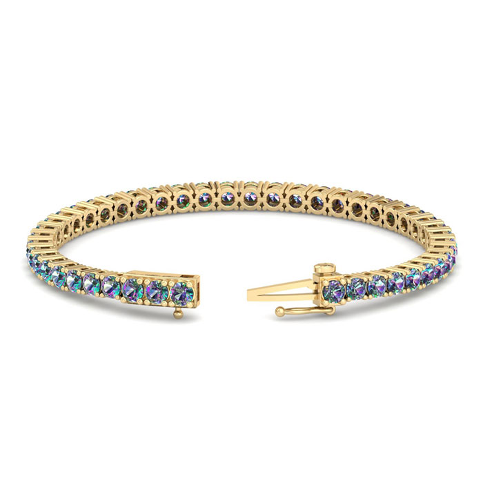 This classic gemstone bracelet features shimmering mystic topaz gemstones. The 6 inch bracelet contains 39 gemstones at 9.75 carats. The 6.5 inch bracelet contains 42 gemstones at 10.75 carats. The 7 inch bracelet contains 45 gemstones at 11.50 carats. The 7.5 inch bracelet contains 49 gemstones at 12.25 carats. The 8 inch bracelet contains 53 gemstones at 13.25 carats. The 8.5 inch bracelet contains 56 gemstones at 14 carats. The 9 inch bracelet contains 59 gemstones at 14.75 carats. This bracelet is approximately 3.8mm wide and is crafted in 14 karat yellow gold. This bracelet has a secure, box with tongue and safety clasp.