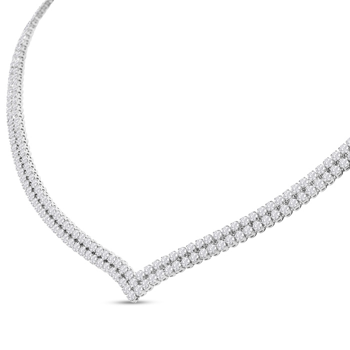This lab grown diamond tennis necklace features 372 round shape lab grown diamnds, each weighing approximately 0.25 carats. Total carat weight is 10 carats and diamond color is G-H, diamond clarity is VS2. This necklace is in 14 karat white gold and has a lobster-claw clasp.