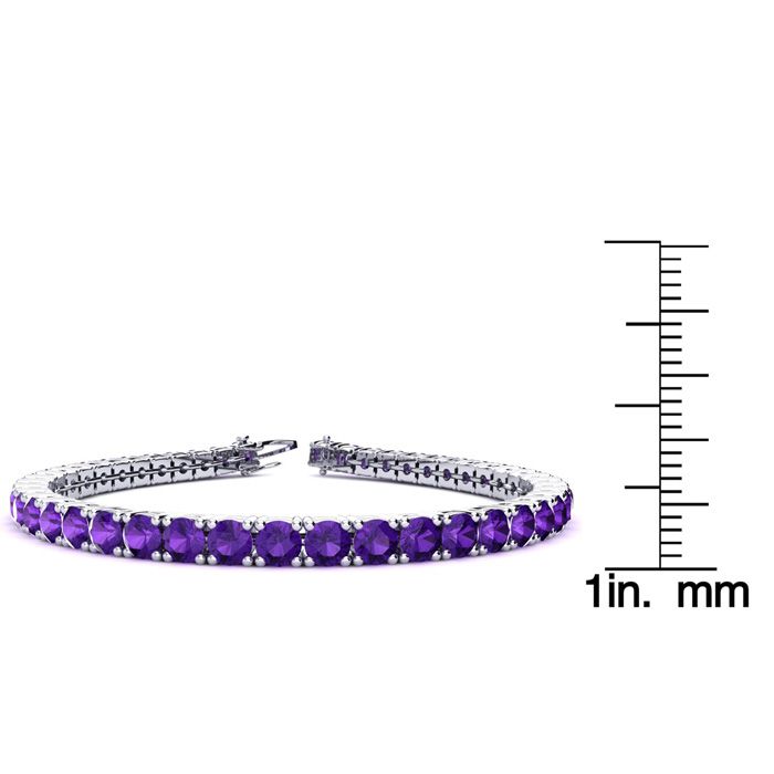 This classic gemstone bracelet features shimmering amethyst gemstones. The 6 inch bracelet contains 39 gemstones at 7.80 carats. The 6.5 inch bracelet contains 42 gemstones at 8.60 carats. The 7 inch bracelet contains 45 gemstones at 9.20 carats. The 7.5 inch bracelet contains 49 gemstones at 9.80 carats. The 8 inch bracelet contains 53 gemstones at 10.60 carats. The 8.5 inch bracelet contains 56 gemstones at 11.20 carats. The 9 inch bracelet contains 59 gemstones at 11.80 carats. This bracelet is approximately 3.8mm wide and is crafted in 14 karat white gold. This bracelet has a secure, box with tongue and safety clasp.