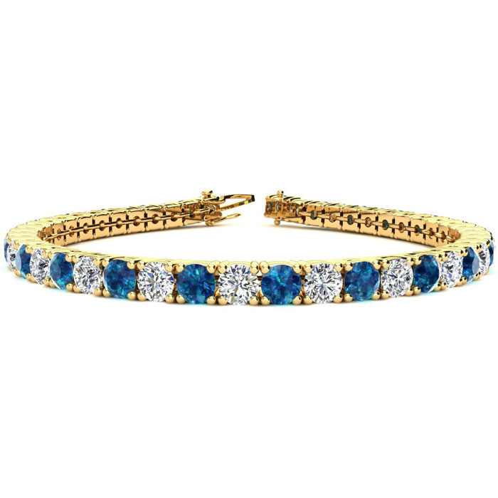 This classic mens diamond bracelet features shimmering white diamonds in I-J color, I1-I2 clarity and blue diamonds in I3 clarity. The 6 inch bracelet contains 39 blue and white diamonds at 7.80 carats. The 6.5 inch bracelet contains 42 blue and white diamonds at 8.60 carats. The 7 inch bracelet contains 45 blue and white diamonds at 9.20 carats. The 7.5 inch bracelet contains 49 blue and white diamonds at 9.80 carats. The 8 inch bracelet contains 53 blue and white diamonds at 10.60 carats. The 8.5 inch bracelet contains 56 blue and white diamonds at 11.20 carats. The 9 inch bracelet contains 59 blue and white diamonds at 11.80 carats. This bracelet is approximately 3.8mm wide and is crafted in 14 karat yellow gold. This bracelet has a secure, box with tongue and safety clasp.