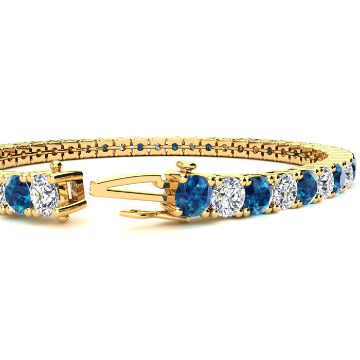 This classic gemstone bracelet features shimmering white diamonds in I-J color, I1-I2 clarity and blue diamonds in I3 clarity. The 6 inch bracelet contains 39 blue and white diamonds at 7.80 carats. The 6.5 inch bracelet contains 42 blue and white diamonds at 8.60 carats. The 7 inch bracelet contains 45 blue and white diamonds at 9.20 carats. The 7.5 inch bracelet contains 49 blue and white diamonds at 9.80 carats. The 8 inch bracelet contains 53 blue and white diamonds at 10.60 carats. The 8.5 inch bracelet contains 56 blue and white diamonds at 11.20 carats. The 9 inch bracelet contains 59 blue and white diamonds at 11.80 carats. This bracelet is approximately 3.8mm wide and is crafted in 14 karat yellow gold. This bracelet has a secure, box with tongue and safety clasp.