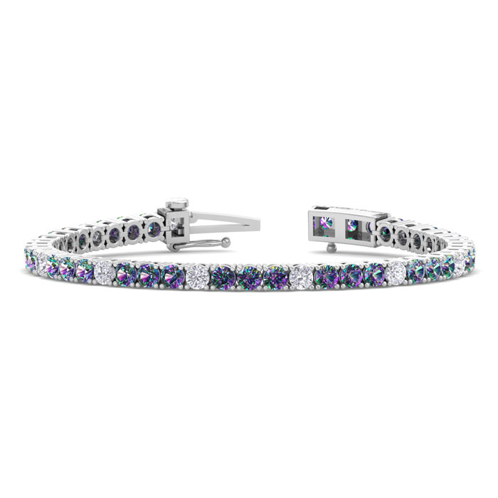 This classic gemstone bracelet features shimmering white diamonds in I-J color, I1-I2 clarity and mystic topaz gemstones. The 6 inch bracelet contains 39 gemstones and diamonds at 9.30 carats. The 6.5 inch bracelet contains 42 gemstones and diamonds at 10.25 carats. The 7 inch bracelet contains 45 gemstones and diamonds at 10.95 carats. The 7.5 inch bracelet contains 49 gemstones and diamonds at 11.65 carats. The 8 inch bracelet contains 53 gemstones and diamonds at 12.60 carats. The 8.5 inch bracelet contains 56 gemstones and diamonds at 13.30 carats. The 9 inch bracelet contains 59 gemstones and diamonds at 14.05 carats. This bracelet is approximately 3.8mm wide and is crafted in 14 karat white gold. This bracelet has a secure, box with tongue and safety clasp.