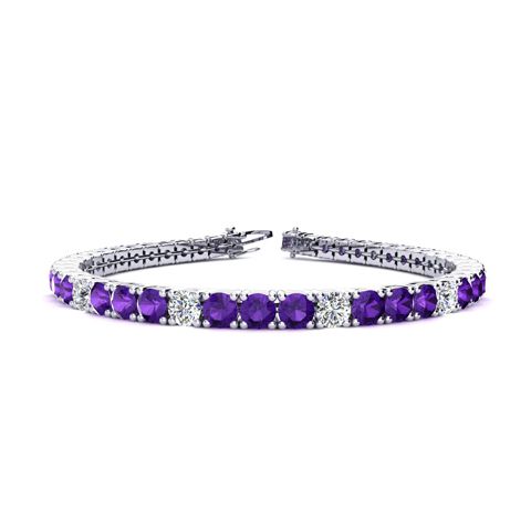 This classic gemstone bracelet features shimmering white diamonds in I-J color, I1-I2 clarity and amethyst gemstones. The 6 inch bracelet contains 39 gemstones and diamonds at 7.80 carats. The 6.5 inch bracelet contains 42 gemstones and diamonds at 8.60 carats. The 7 inch bracelet contains 45 gemstones and diamonds at 9.20 carats. The 7.5 inch bracelet contains 49 gemstones and diamonds at 9.80 carats. The 8 inch bracelet contains 53 gemstones and diamonds at 10.60 carats. The 8.5 inch bracelet contains 56 gemstones and diamonds at 11.20 carats. The 9 inch bracelet contains 59 gemstones and diamonds at 11.80 carats. This bracelet is approximately 3.8mm wide and is crafted in 14 karat white gold. This bracelet has a secure, box with tongue and safety clasp.