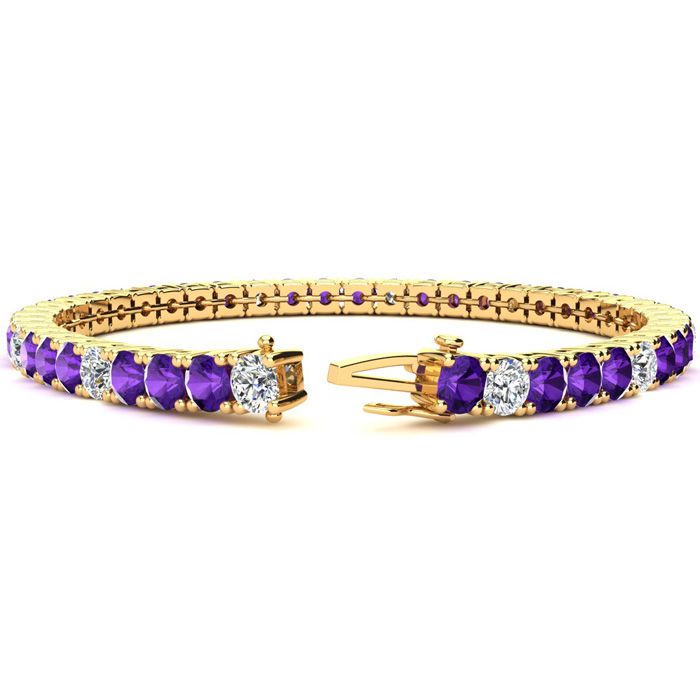 This classic gemstone bracelet features shimmering white diamonds in I-J color, I1-I2 clarity and amethyst gemstones. The 6 inch bracelet contains 39 gemstones and diamonds at 7.80 carats. The 6.5 inch bracelet contains 42 gemstones and diamonds at 8.60 carats. The 7 inch bracelet contains 45 gemstones and diamonds at 9.20 carats. The 7.5 inch bracelet contains 49 gemstones and diamonds at 9.80 carats. The 8 inch bracelet contains 53 gemstones and diamonds at 10.60 carats. The 8.5 inch bracelet contains 56 gemstones and diamonds at 11.20 carats. The 9 inch bracelet contains 59 gemstones and diamonds at 11.80 carats. This bracelet is approximately 3.8mm wide and is crafted in 14 karat yellow gold. This bracelet has a secure, box with tongue and safety clasp.