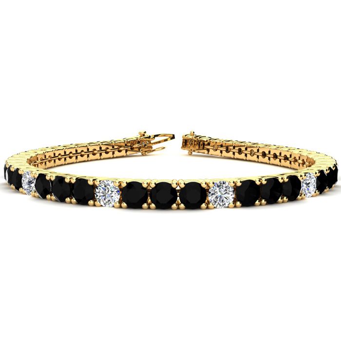 This classic gemstone bracelet features shimmering white diamonds in I-J color, I1-I2 clarity and black diamonds in I3 clarity. The 6 inch bracelet contains 39 black and white diamonds at 7.80 carats. The 6.5 inch bracelet contains 42 black and white diamonds at 8.60 carats. The 7 inch bracelet contains 45 black and white diamonds at 9.20 carats. The 7.5 inch bracelet contains 49 black and white diamonds at 9.80 carats. The 8 inch bracelet contains 53 black and white diamonds at 10.60 carats. The 8.5 inch bracelet contains 56 black and white diamonds at 11.20 carats. The 9 inch bracelet contains 59 black and white diamonds at 11.80 carats. This bracelet is approximately 3.8mm wide and is crafted in 14 karat yellow gold. This bracelet has a secure, box with tongue and safety clasp.